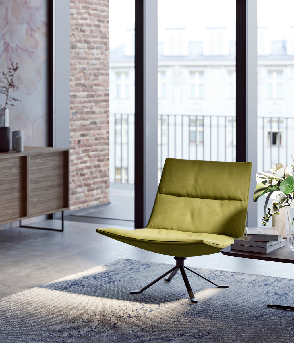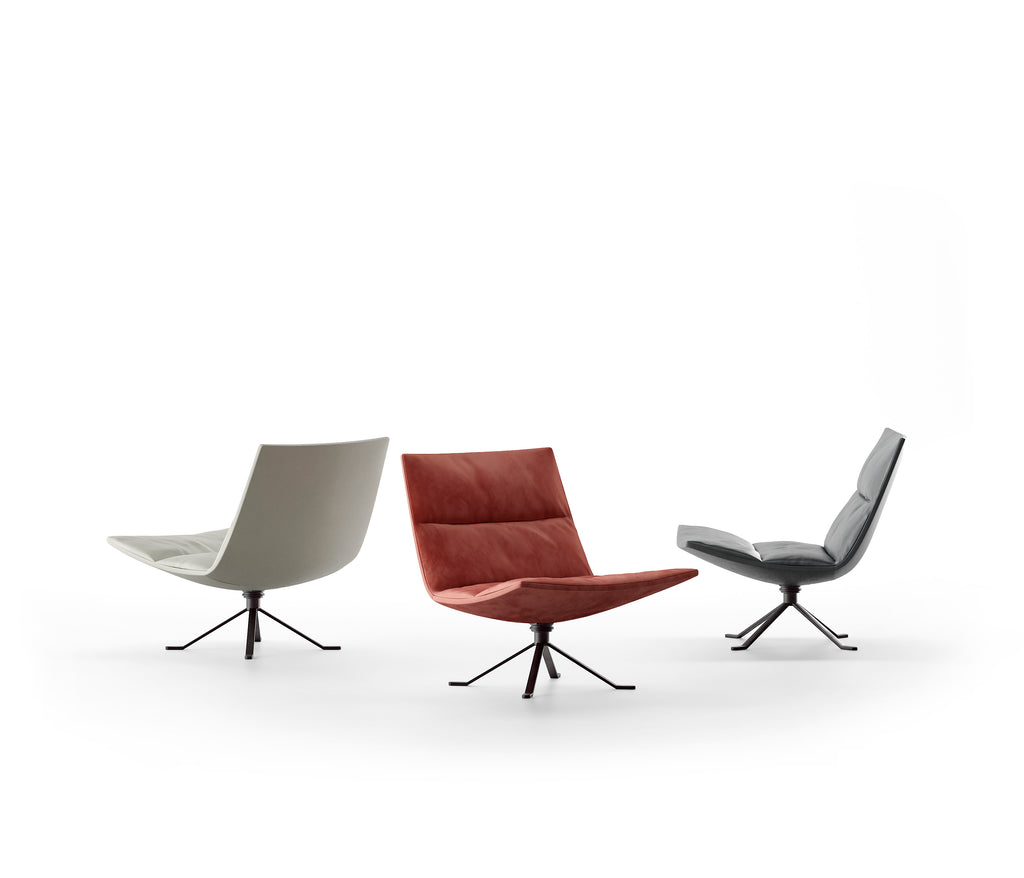 eco-leather, microfiber or leather, always with non-removable covers. FEATURES: This product is not classified as fire-retardant. STANDARD FEET: Base made of four metal spokes with